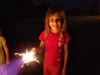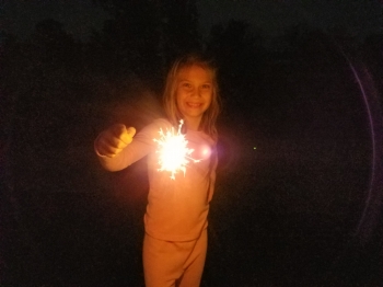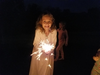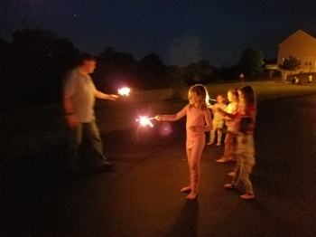 First let me say I am grateful! Grateful that the basement where I fell was a good place to recover, grateful that although our AC died about the same time, Josh and Kerin loaned us a floor unit and we all hung out in the only cool space in the house until it was replaced, so I had lots of company for about two weeks. Grateful that when I did get to the Dr. a week later and discovered it was actually two fractures, I did not need surgery to repair anything, as I found out later can be common with tibea plateau. No screws and plates yay! I am grateful my Dan is so helpful and responds right away, cheerfully, to every texted request. And I am grateful for Bernie to run the errands I usually run to keep the household going and everyone fed. And for running the washer and dryer. (I still get to sort and fold.) :) I am grateful early on Bernie brought down my sewing machine so I could try to finish the project I had started right before I fell. (slipcovers) I am grateful for visits from my family and grandchildren, and having one chance to work with them on the violin. I am grateful I can sit up at the piano and play. I am grateful for a recliner that reclines almost flat. I am grateful for my laptop and smart phone. I am grateful for cards and emails and flowers! I am grateful that a family friend used my ticket to take my place and help supervise six grandchildren at the 'The Sound of Music' staged production at the Kennedy Center. And we are so incredibly grateful for and blessed by the financial support many of you sent that helped so much with all the extra expenses of the air conditioners as well as Dr. bills, x-rays, and PT visits. I am grateful we still celebrated Father's Day and the fourth of July with our children coming here to visit. My children, their spouses, and my grandchildren bring some sparkles to my life - so I had to include a few pictures Kerin took of some of the grands with sparklers when they were here but out of my sight and beyond where I could see them in our driveway.